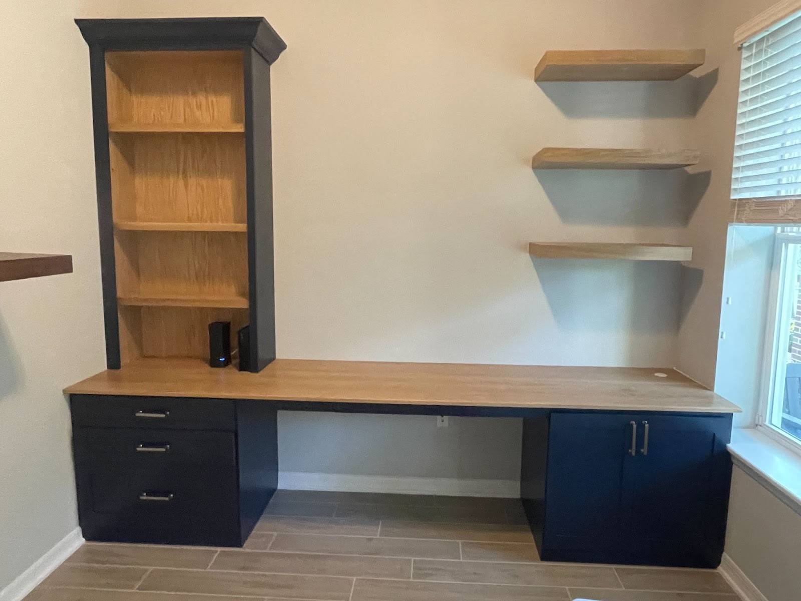 The office build was a fantastic build. The customer had been using a table as a desk space, but wanted something more functional and something that would bring some character to the space. They also needed something that would provide a space to hide the printer and to hold a bunch of files. Knowing what they were looking for and having put together a rough sketch we put together a plan and began the process.