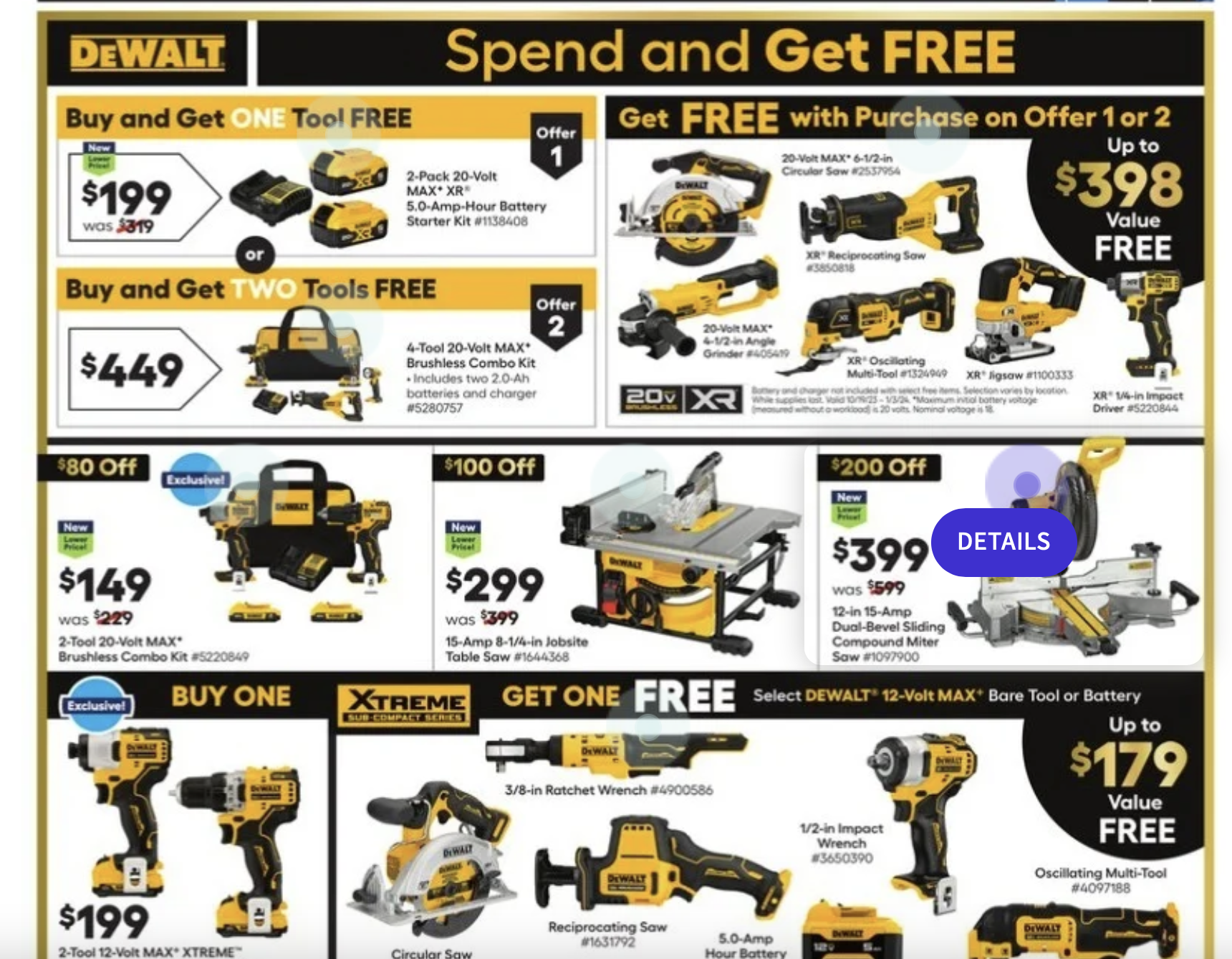 The next deal is actually a combo option. At Lowes you can find these combo options for DeWalt, the first option being you purchase some batteries and you are able to choose a free tool from a list of available tools. The 2nd option is to buy a 4 tool combo kit and you’ll be able to choose 2 tools from the previously mentioned list. The first option with the batteries will cost you $199, while the 4 tool combo with the 2 bonus tools will be a $449 hit to the account. Check out the options in the image below.