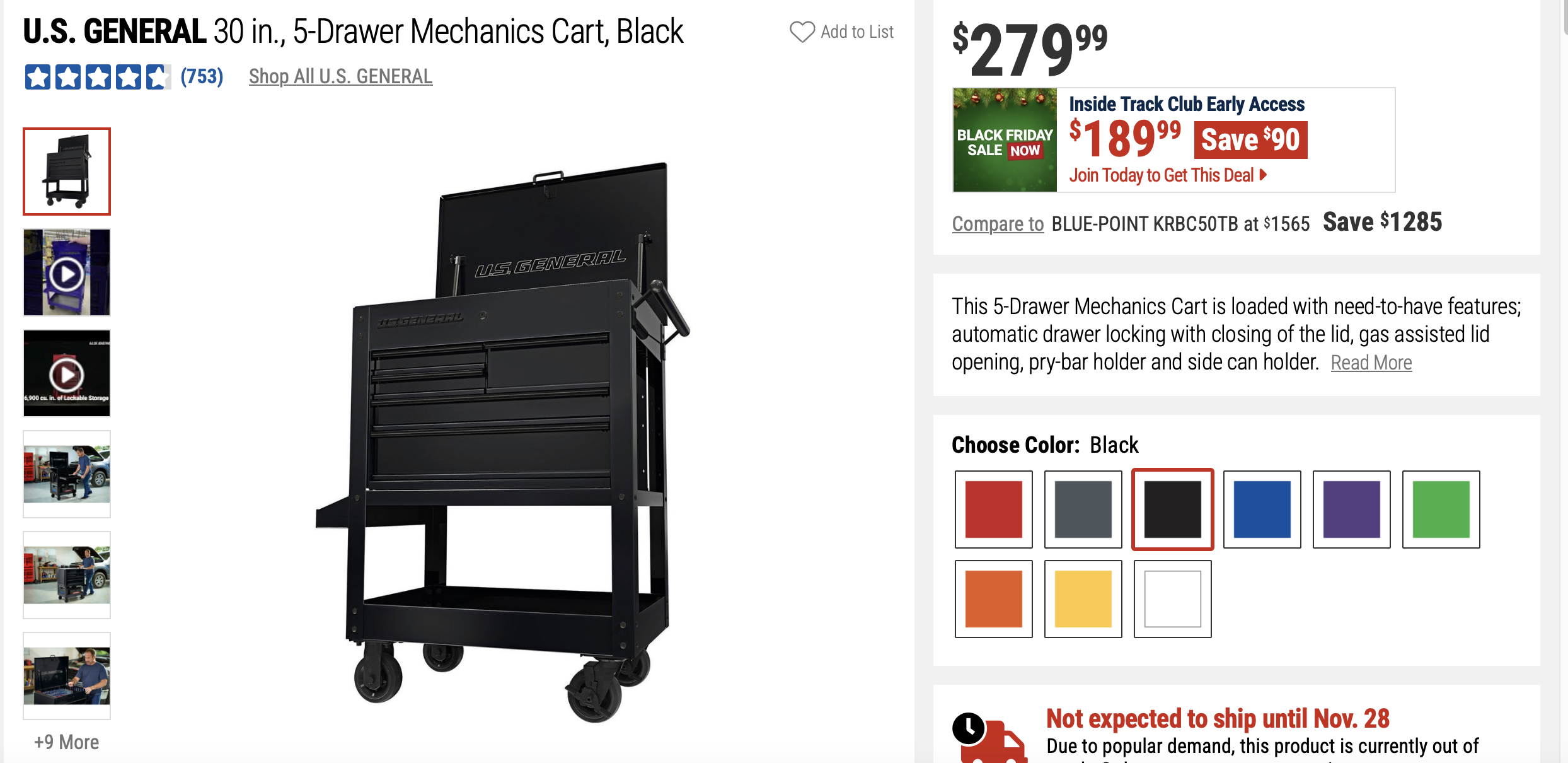 We leave the big box stores and head over to the discount king of the tool world, Harbor Freight. They have a storage piece on sale that would be great for your shop if you’re looking for a little extra storage. They have a 30″ 5 drawer mechanics cart on sale for $189 compared to the typical $279. This is a great way to had some functional storage for a shop.