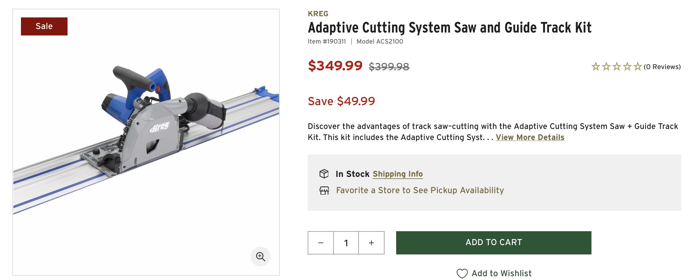The next one is one of my favorite tools I currently own and I highly recommend any woodworker get one of these at some point in your woodworking journey. The Kreg Track saw is a fantastic tool. Now it’s the only track saw I’ve owned so maybe the others are better, but I can tell you a track saw is a worth while investment. It saves so much time and helps you make less mistakes. Kreg has theirs on sale for $349 this week which is $50 off the retail price. It’s a great tool and well worth the money. Kreg Track Saw -WoodCraft – (also on Amazon $349 was $399) https://amzn.to/3V1uK6c