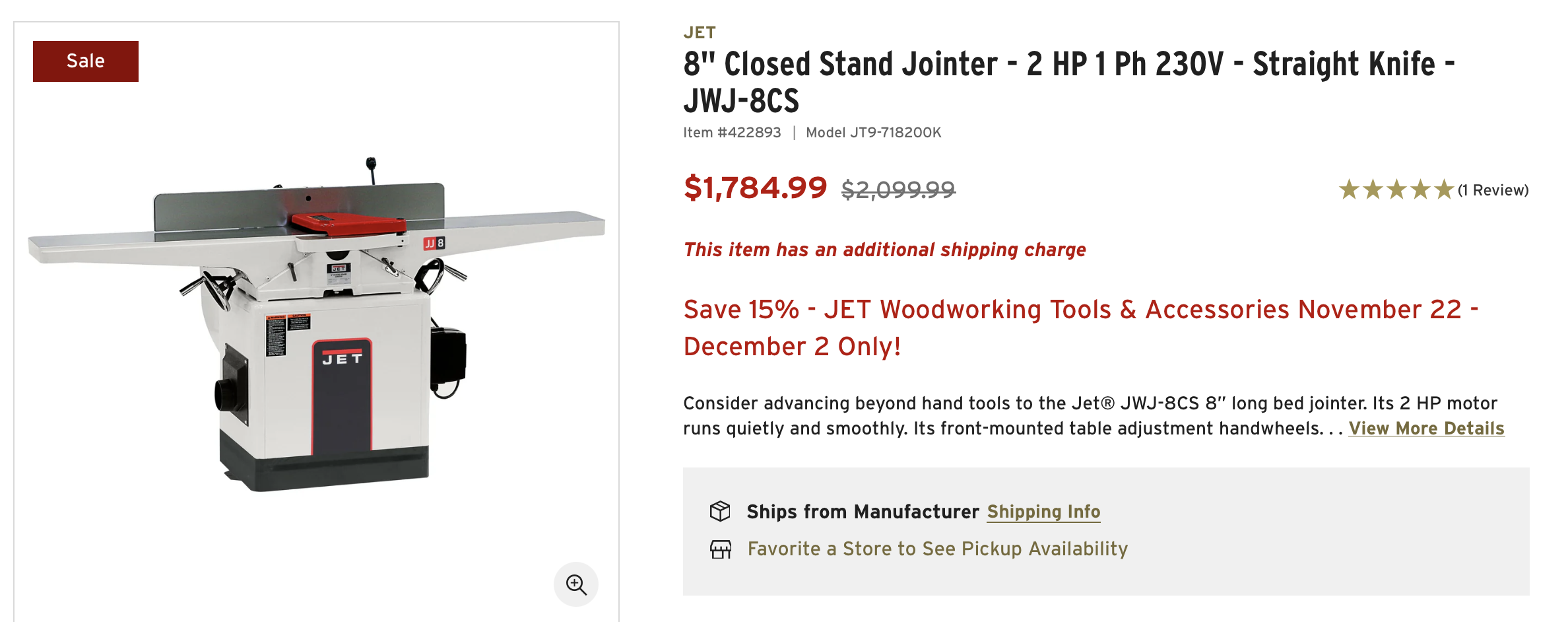 This tool is definitely more focused towards the professional woodworker that is looking to upgrade their shop. The Jet 8″ jointer is on sale for about $500 off, bringing the price down from $2499 to $1999. This is a big boy tool and is a pretty penny, but Jet is a very trusted brand and the large jointers are great to work with. *Picture below is smaller version**