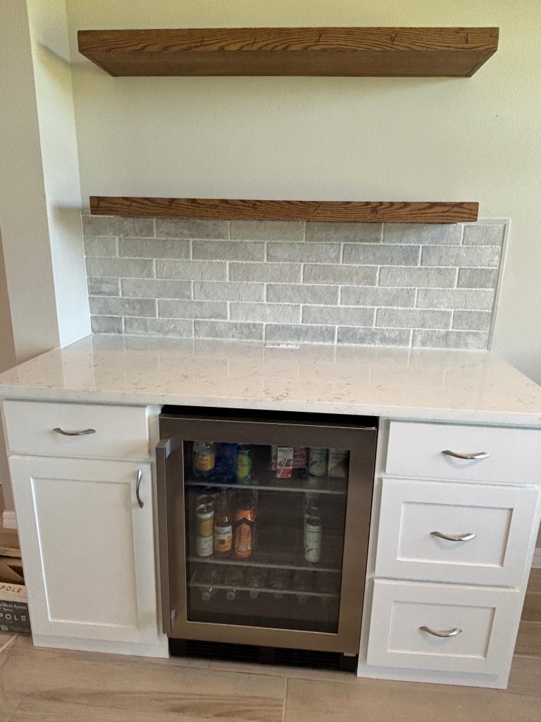 The client also mentioned the idea of adding the floating shelves and wanted to carry the new backsplash that we were installing from the kitchen into the coffee bar. So a pair of white oak shelves were floated and matched the custom mantle that had been made for the fireplace project. This was the inspiration, and now it was time to turn it into a reality.